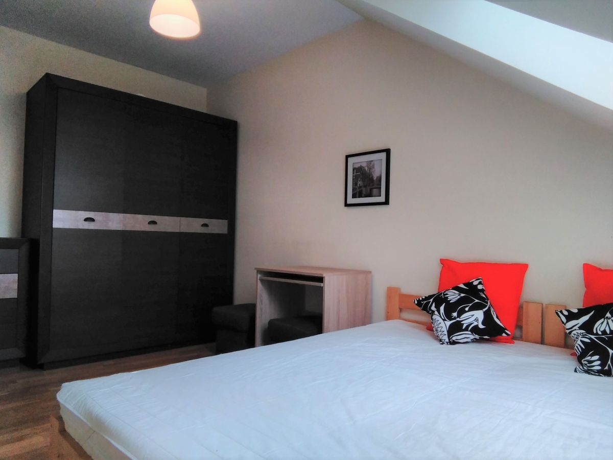Mieszkanie znajduje się w budynku z lat 2007-2008, a pokój jest w pełni umeblowany, słoneczny i rozświetlony dzięki oknom wychodzącym na południowy- wschód. Obecnie w mieszkaniu mieszkają dwaj mężczyźni i kobieta, co tworzy przyjazną i spokojną atmosferę.